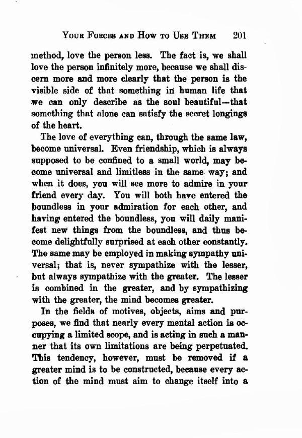 The love of everything can, through the same law, become universal. Even friendship, which is always supposed to be confined to a small world, may become universal and limitless in the same way; and when it does, you will see more to admire in your friend every day. You will both have entered the boundless in your admiration for each other, and having entered the boundless, you will daily manifest new things from the boundless, and thus become delightfully surprised at each other constantly. The same may be employed in making sympathy universal; that is, never sympathise with the lesser, but always sympathise with the greater. The lesser is combined in the greater, and by sympathising with the greater, the mind becomes greater.