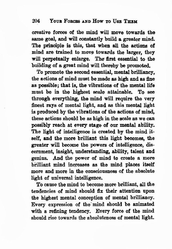 To promote the second essential, mental brilliancy, the actions of mind must be made as high and as fine as possible; that is, the vibrations of the mental life must be in the highest scale attainable. To see through everything the mind will require the very finest rays of mental light, and as this mental light is produced by the vibrations of the actions of mind, these actions should be as high in the scale as we can possibly reach at every stage of our mental ability. The light of intelligence is created by the mind itself, and the more brilliant this light becomes, the greater will become the powers of intelligence, discernment, insight, understanding, ability, talent and genius. And the power of mind to create a more brilliant mind increases as the mind places itself more and more in the consciousness of the absolute light of universal intelligence.
