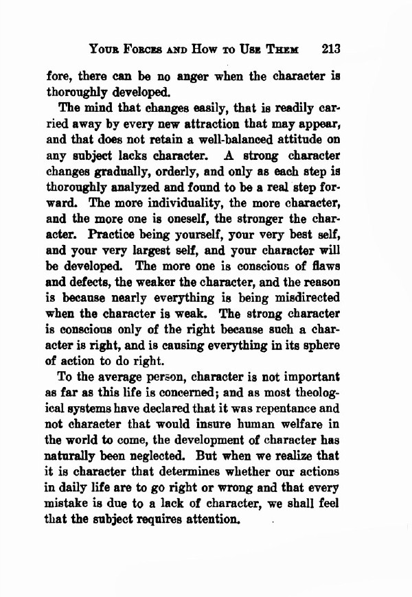 To the average person, character is not important as far as this life is concerned; and as most theological systems have declared that it was repentance and not character that would insure human welfare in the world to come, the development of character has naturally been neglected. But when we realize that it is character that determines whether our actions in daily life are to go right or wrong and that every mistake is due to a lack of character, we shall feel that the subject requires attention.