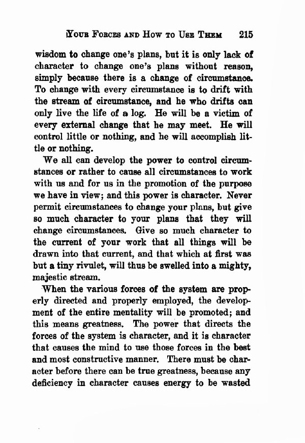 We all can develop the power to control circumstances or rather to cause all circumstances to work with us and for us in the promotion of the purpose we have in view; and this power is character. Never permit circumstances to change your plans, but give so much character to your plans that they will change circumstances. Give so much character to the current of your work that all things will be drawn into that current, and that which at first was but a tiny rivulet, will thus be swelled into a mighty, majestic stream.