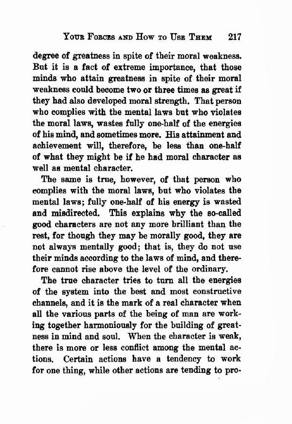 The same is true, however, of that person who complies with the moral laws, but who violates the mental laws; fully one-half of their energy is wasted and misdirected. This explains why the so-called good characters are not any more brilliant than the rest, for though they may be morally good, they are not always mentally good; that is, they do not use their minds according to the laws of mind, and therefore cannot rise above the level of the ordinary.
