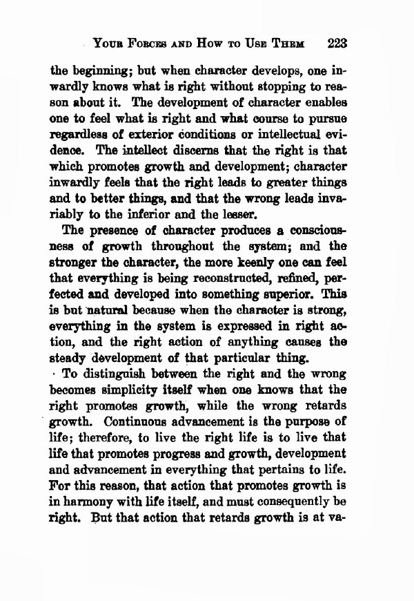 To distinguish between the right and the wrong becomes simplicity itself when one knows that the right promotes growth, while the wrong retards growth. Continuous advancement is the purpose of life; therefore, to live the right life is to live that life that promotes progress and growth, development and advancement in everything that pertains to life. For this reason, that action that promotes growth is in harmony with life itself, and must consequently be right. But that action that retards growth is at variance