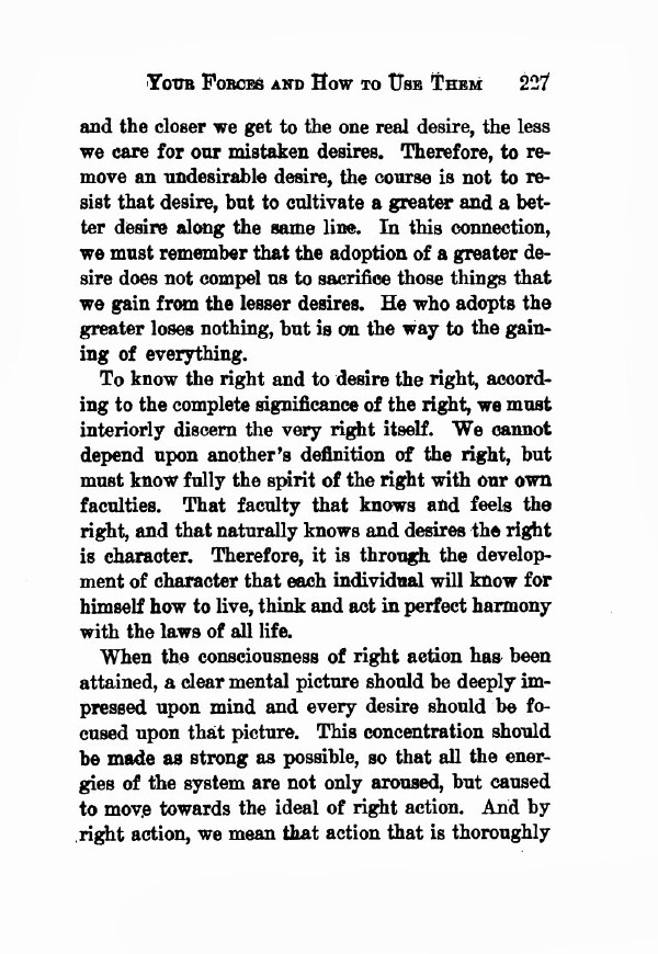 When the consciousness of right action has been attained, a clear mental picture should be deeply impressed upon mind and every desire should be focused upon that picture. This concentration should be made as strong as possible, so that all the energies of the system are not only aroused, but caused to move towards the ideal of right action. And by right action, we mean that action that is thoroughly