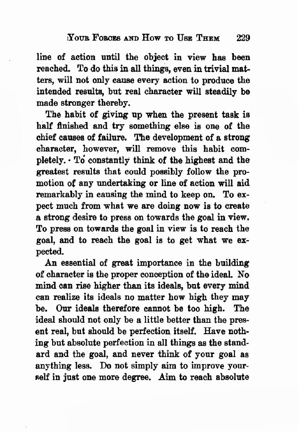 The habit of giving up when the present task is half finished and try something else is one of the chief causes of failure. The development of a strong character, however, will remove this habit completely. To constantly think of the highest and the greatest results that could possibly follow the promotion of any undertaking or line of action will aid remarkably in causing the mind to keep on. To expect much from what we are doing now is to create a strong desire to press on towards the goal in view. To press on towards the goal in view is to reach the goal, and to reach the goal is to get what we expected.