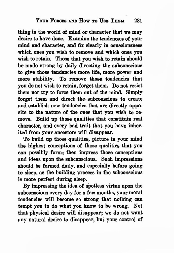 in the world of mind or character that we may desire to have done. Examine the tendencies of your mind and character, and fix clearly in conscious- ness which ones you wish to remove and which ones you wish to retain. Those that you wish to retain should be made strong by daily directing the subconscious to give those tendencies more life, more power and more stability. To remove those tendencies that you do not wish to retain, forget them. Do not resist them nor try to force them out of the mind. Simply forget them and direct the subconscious to create and establish new tendencies that are directly opposite to the nature of the ones that you wish to remove. Build up those qualities that constitute real character, and every bad trait that you have inherited from your ancestors will disappear.