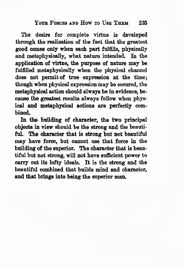 The desire for complete virtue is developed through the realization of the fact that the greatest good comes only when each part fulfils, physically and metaphysically, what nature intended. In the application of virtue, the purpose of nature may be fulfilled metaphysically when the physical channel does not permit of true expression at the time; though when physical expression may be secured, the metaphysical action should always be in evidence, because the greatest results always follow when physical and metaphysical actions are perfectly combined.