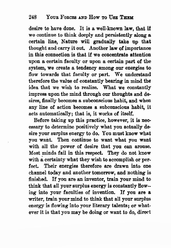 Before taking up this practice, however, it is necessary to determine positively what you actually desire your surplus energy to do. You must know what you want. Then continue to want what you want with all the power of desire that you can arouse. Most minds fail in this respect. They do not know with a certainty what they wish to accomplish or perfect. Their energies therefore are drawn into one channel today and another tomorrow, and nothing is finished. If you are an inventor, train your mind to think that all your surplus energy is constantly flowing into your faculties of invention. If you are a writer, train your mind to think that all your surplus energy is flowing into your literary talents; or whatever it is that you may be doing or want to do, direct