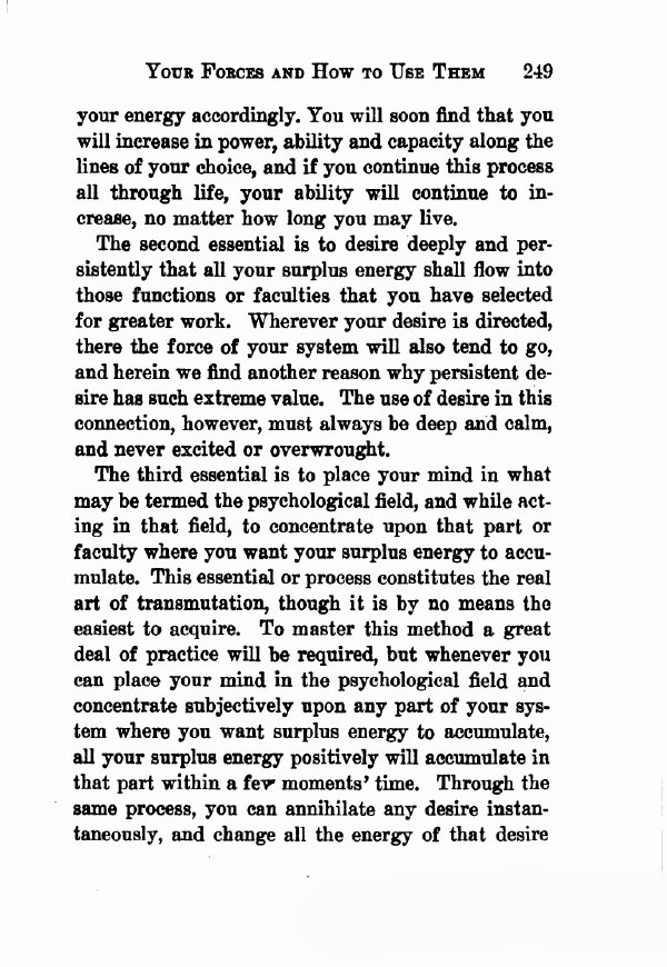 The third essential is to place your mind in what may be termed the psychological field, and while acting in that field, to concentrate upon that part or faculty where you want your surplus energy to accumulate. This essential or process constitutes the real art of transmutation, though it is by no means the easiest to acquire. To master this method a great deal of practice will be required, but whenever you can place your mind in the psychological field and concentrate subjectively upon any part of your system where you want surplus energy to accumulate, all your surplus energy positively will accumulate in that part within a few moments' time. Through the same process, you can annihilate any desire instantaneously, and change all the energy of that desire