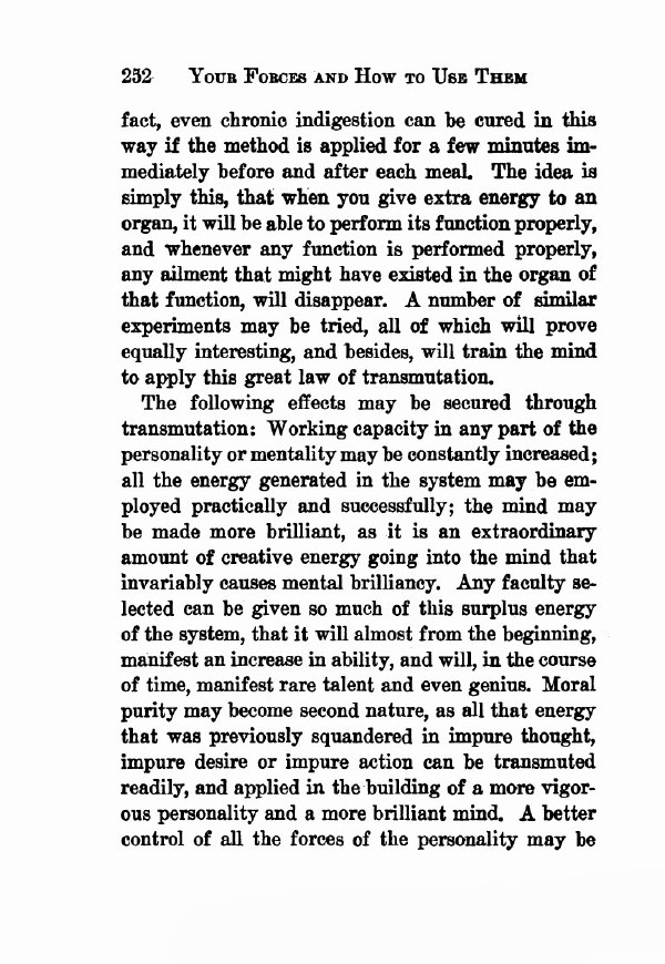 The following effects may be secured through transmutation: Working capacity in any part of the personality or mentality may be constantly increased; all the energy generated in the system may be employed practically and successfully; the mind may be made more brilliant, as it is an extraordinary amount of creative energy going into the mind that invariably causes mental brilliancy. Any faculty selected can be given so much of this surplus energy of the system, that it will almost from the beginning, manifest an increase in ability, and will, in the course of time, manifest rare talent and even genius. Moral purity may become second nature, as all that energy that was previously squandered in impure thought, impure desire or impure action can be transmuted readily, and applied in the building of a more vigorous personality and a more brilliant mind. A better control of all the forces of the personality may be