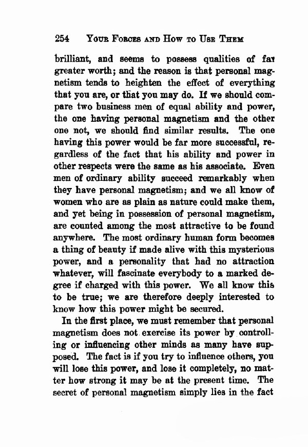 In the first place, we must remember that personal magnetism does not exercise its power by controlling or influencing other minds as many have supposed. The fact is if you try to influence others, you will lose this power, and lose it completely no matter how strong it may be at the present time. The secret of personal magnetism simply lies in the fact