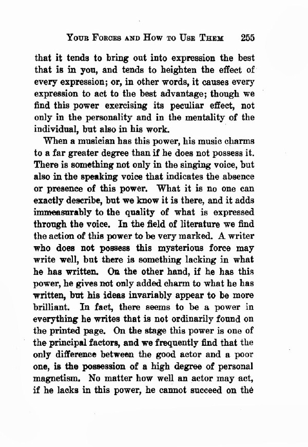 When a musician has this power, his music charms to a far greater degree than if he does not possess it. There is something not only in the singing voice, but also in the speaking voice that indicates the absence or presence of this power. What it is no one can exactly describe, but we know it is there, and it adds immeasurably to the quality of what is expressed through the voice. In the field of literature we find the action of this power to be very marked. A writer who does not possess this mysterious force may write well, but there is something lacking in what he has written. On the other hand, if he has this power, he gives not only added charm to what he has written, but his ideas invariably appear to be more brilliant. In fact, there seems to be a power in everything he writes that is not ordinarily found on the printed page. On the stage this power is one of the principal factors, and we frequently find that the only difference between the good actor and a poor one, is the possession of a high degree of personal magnetism. No matter how well an actor may act, if he lacks in this power, he cannot succeed on the