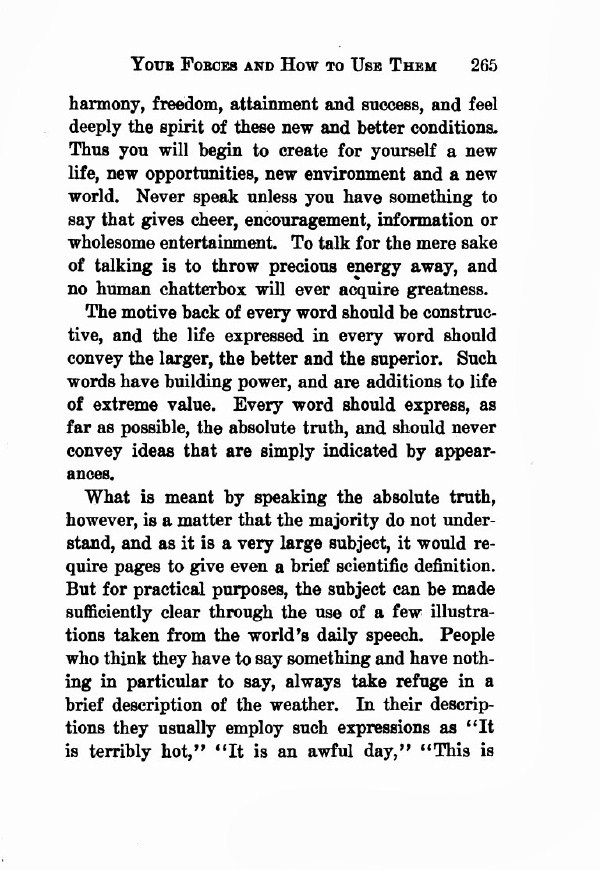 What is meant by speaking the absolute truth, however, is a matter that the majority do not understand, and as it is a very large subject, it would require pages to give even a brief scientific definition. But for practical purposes, the subject can be made sufficiently clear through the use of a few illustrations taken from the world's daily speech. People who think they have to say something and have nothing in particular to say, always take refuge in a brief description of the weather. In their descriptions they usually employ such expressions as "It is terribly hot," "it is an awful day," "This is