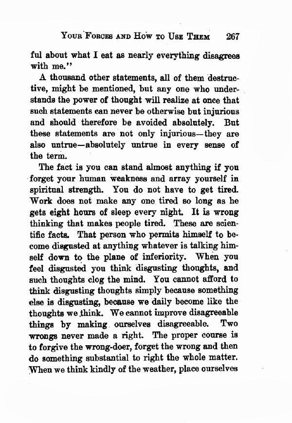 The fact is you can stand almost anything if you forget your human weakness and array yourself in spiritual strength. You do not have to get tired. Work does not make anyone tired so long as he gets eight hours of sleep every night. It is wrong thinking that makes people tired. These are scientific facts. That person who permits himself to become disgusted at anything whatever is talking himself down to the plane of inferiority. When you feel disgusted you think disgusting thoughts, and such thoughts clog the mind. You cannot afford to think disgusting thoughts simply because something else is disgusting, because we daily become like the thoughts we think. We cannot improve disagreeable things by making ourselves disagreeable. Two wrongs never made a right. The proper course is to forgive the wrong-doer, forget the wrong and then do something substantial to right the whole matter. When we think kindly of the weather, place ourselves
