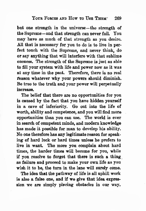 but one strength in the universe -- the strength of the Supreme -- and that strength can never fail. You may have as much of that strength as you desire. All that is necessary for you to do is to live in perfect touch with the Supreme, and never think, do or say anything that will interfere with that sublime oneness. The strength of the Supreme is just as able to fill your system with life and power now as it was at any time in the past. Therefore, there is no real reason whatever why your power should diminish. Be true to the truth and your power will perpetually increase.