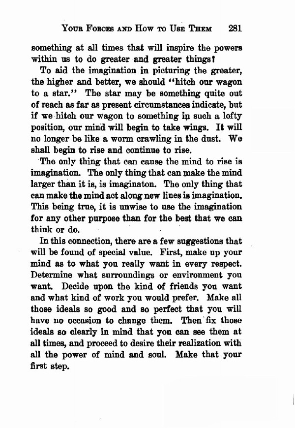 In this connection, there are a few suggestions that will be found of special value. First, make up your mind as to what you really want in every respect. Determine what surroundings or environment you want. Decide upon the kind of friends you want and what kind of work you would prefer. Make all those ideals so good and so perfect that you will have no occasion to change them. Then fix those ideals so clearly in mind that you can see them at all times, and proceed to desire their realization with all the power of mind and soul. Make that your first step.