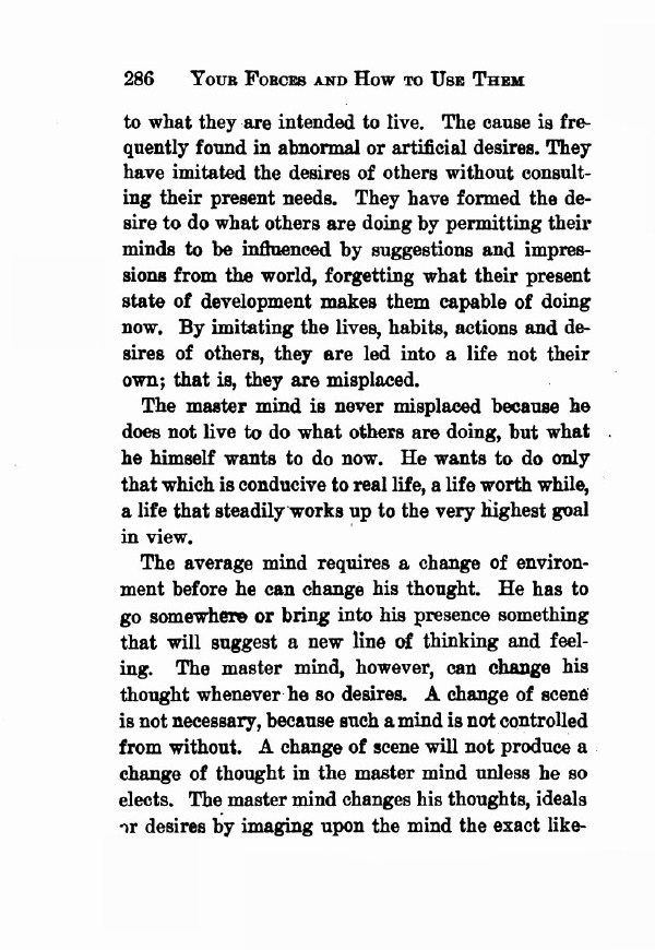 The average mind requires a change of environment before he can change his thought. He has to go somewhere or bring into his presence something that will suggest a new line of thinking and feeling. The master mind, however, can change his thought whenever he so desires. A change of scene is not necessary, because such a mind is not controlled from without. A change of scene will not produce a change of thought in the master mind unless he so elects. The master mind changes his thoughts, ideals or desires by imaging upon the mind the exact likeness