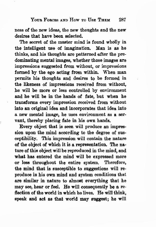 The secret of the master mind is found wholly in the intelligent use of imagination. Man is as he thinks, and his thoughts are patterned after the predominating mental images, whether those images are impressions suggested from without, or impressions formed by the ego acting from within. When man permits his thoughts and desires to be formed in the likeness of impressions received from without, he will be more or less controlled by environment and he will be in the hands of fate, but when he transforms every impression received from without into an original idea and incorporates that idea into a new mental image, he uses environment as a servant, thereby placing fate in his own hands.