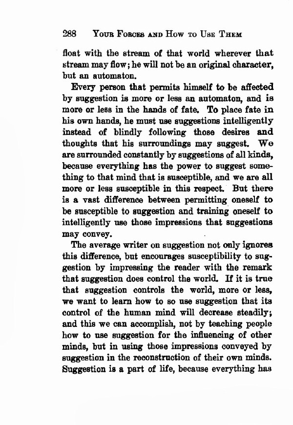 Every person that permits himself to be affected by suggestion is more or less an automaton, and is more or less in the hands of fate. To place fate in his own hands, he must use suggestions intelligently instead of blindly following those desires and thoughts that his surroundings may suggest. We are surrounded constantly by suggestions of all kinds, because everything has the power to suggest something to that mind that is susceptible, and we are all more or less susceptible in this respect. But there is a vast difference between permitting oneself to be susceptible to suggestion and training oneself to intelligently use those impressions that suggestions may convey.