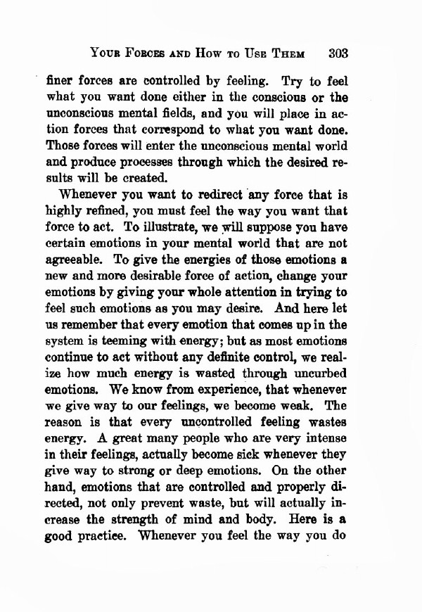 Whenever you want to redirect any force that is highly refined, you must feel the way you want that force to act. To illustrate, we will suppose you have certain emotions in your mental world that are not agreeable. To give the energies of those emotions a new and more desirable force of action, change your emotions by giving your whole attention in trying to feel such emotions as you may desire. And here let us remember that every emotion that comes up in the system is teeming with energy; but as most emotions continue to act without any definite control, we realize how much energy is wasted through uncurbed emotions. We know from experience, that whenever we give way to our feelings, we become weak. The reason is that uncontrolled feeling wastes energy . A great many people who are very intense in their feelings, actually become sick whenever they give way to strong or deep emotions. On the other hand, emotions that are controlled and properly directed, not only prevent waste, but will actually increase the strength of mind and body. Here is a good practice. Whenever you feel the way you do
