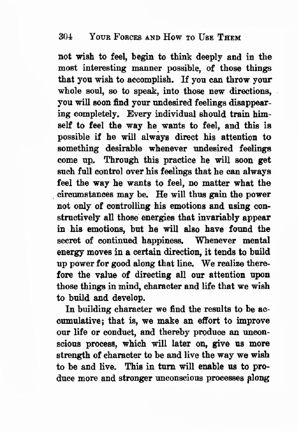 not wish to feel, begin to think deeply and in the most interesting manner possible, of those things that you wish to accomplish. If you can throw your whole soul, so to speak, into those new directions, you will soon find your undesired feelings disappearing completely. Every individual should train himself to feel the way he wants to feel, and this is possible if he will always direct his attention to something desirable whenever undesired feelings come up. Through this practice he will soon get such full control over his feelings that he can always feel the way he wants to feel, no matter what the circumstances may be. He will thus gain the power not only of controlling his emotions and using constructively all those energies that invariably appear in his emotions, but he will also have found the secret of continued happiness. Whenever mental energy moves in a certain direction, it tends to build up power for good along that line. We realize therefore the value of directing all our attention upon those things in mind, character and life that we wish to build and develop.