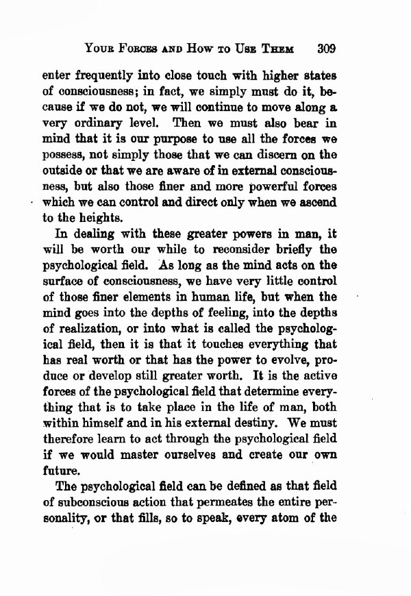 In dealing with these greater powers in man, it will be worth our while to reconsider briefly the psychological field. As long as the mind acts on the surface of consciousness, we have very little control of those finer elements in human life, but when the mind goes into the depths of feeling, into the depths of realization, or into what is called the psychological field, then it is that it touches everything that has real worth or that has the power to evolve, produce or develop still greater worth. It is the active forces of the psychological field that determine everything that is to take place in the life of man, both within himself and in his external destiny. We must therefore learn to act through the psychological field if we would master ourselves and create our own future.