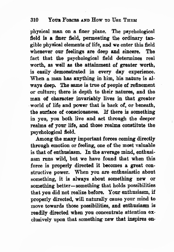 Among the many important forces coming directly through emotion or feeling, one of the most valuable is that of enthusiasm. In the average mind, enthusiasm runs wild, but we have found that when this force is properly directed it becomes a great constructive power. When you are enthusiastic about something, it is always about something new or something better -- something that holds possibilities that you did not realize before. Your enthusiasm, if properly directed, will naturally cause your mind to move towards those possibilities, and enthusiasm is readily directed when you concentrate attention exclusively upon that something new that inspires