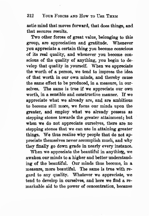 Two other forces of great value, belonging to this group, are appreciation and gratitude. Whenever you appreciate a certain thing you become conscious of its real quality, and whenever you become conscious of the quality of anything, you begin to develop that quality in yourself. When we appreciate the worth of a person, we tend to impress the idea of that worth in our own minds, and thereby cause the same effect to be produced, in a measure, in ourselves. The same is true if we appreciate our own worth, in a sensible and constructive manner. If we appreciate what we already are, and are ambitious to become still more, we focus our minds upon the greater, and employ what we already possess as stepping-stones towards the greater attainment; but when we do not appreciate ourselves, there are no stepping stones that we can use in attaining greater things. We thus realize why people that do not appreciate themselves never accomplish much, and why they finally go downgrade in nearly every instance.