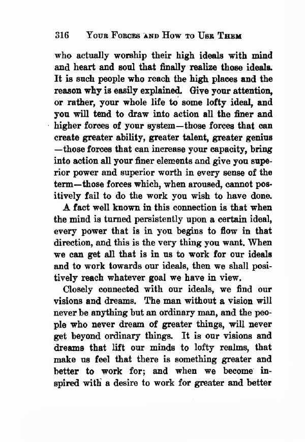 who actually worship their high ideals with mind and heart and soul that finally realize those ideals. It is such people who reach the high places and the reason why is easily explained. Give your attention, or rather, your whole life to some lofty ideal, and you will tend to draw into action all the finer and higher forces of your system -- those forces that can create greater ability, greater talent, greater genius -- those forces that can increase your capacity, bring into action all your finer elements and give you superior power and superior worth in every sense of the term -- those forces which, when aroused, cannot positively fail to do the work you wish to have done.