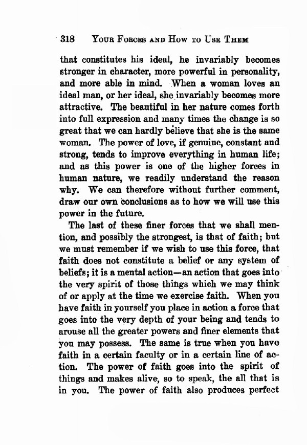 The last of these finer forces that we shall mention, and possibly the strongest, is that of faith; but we must remember if we wish to use this force, that faith does not constitute a belief or any system of beliefs; it is a mental action -- an action that goes into the very spirit of those things which we may think of or apply at the time we exercise faith. When you have faith in yourself you place in action a force that goes into the very depth of your being and tends to arouse all the greater powers and finer elements that you may possess. The same is true when you have faith in a certain faculty or in a certain line of action. The power of faith goes into the spirit of things and makes alive, so to speak, the all that is in you. The power of faith also produces perfect