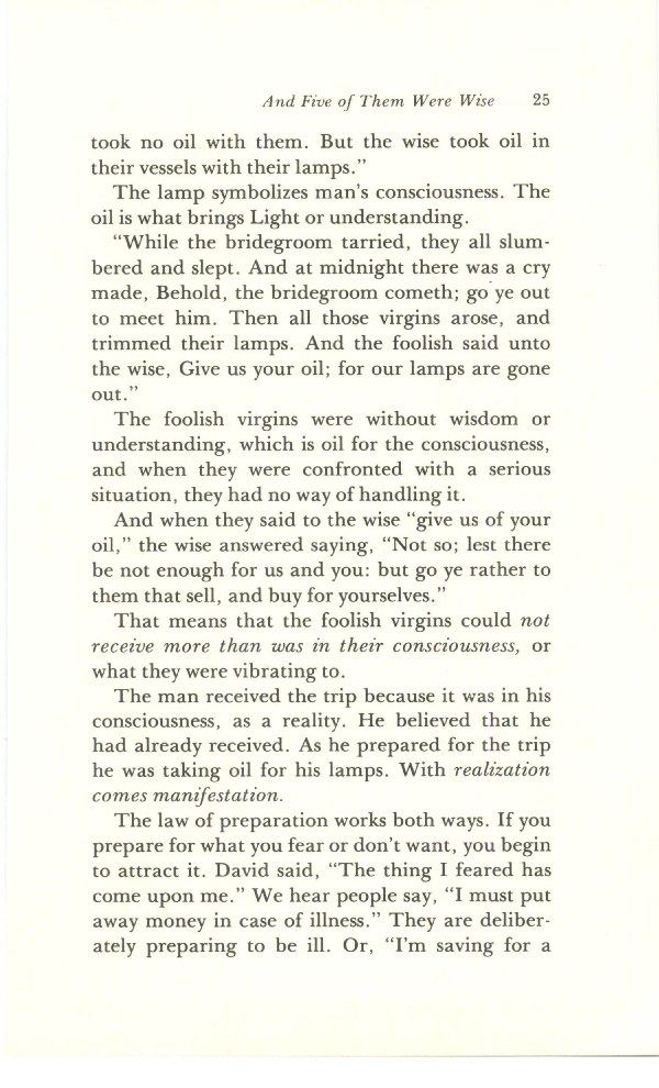 The man received the trip because it was in his consciousness, as a reality. He believed that he had already received. As he prepared for the trip he was taking oil for his lamps. With realization comes manifestation.