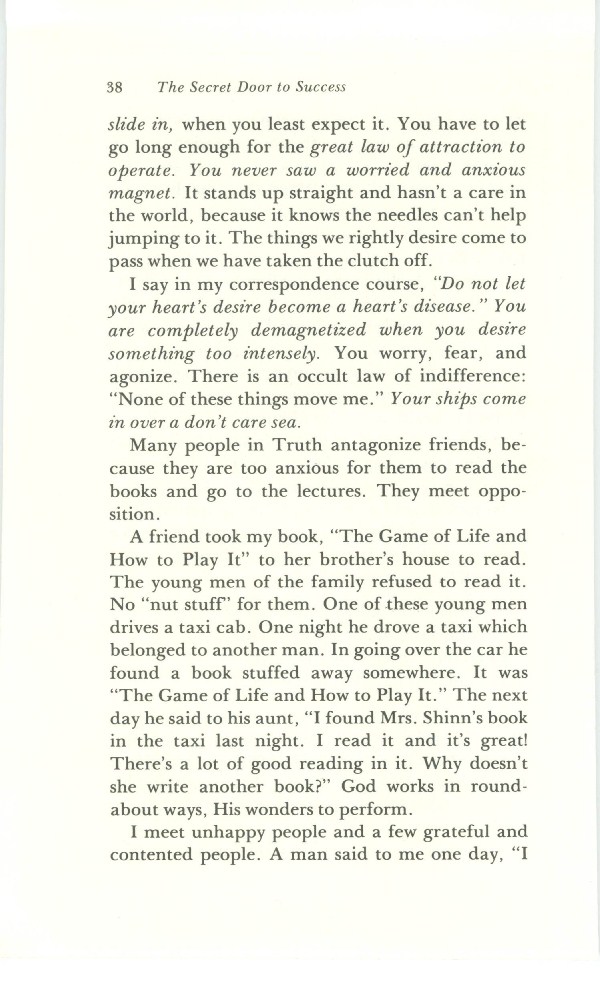 A friend took my book, "The Game of Life and How to Play It" to her brother's house to read. The young men of the family refused to read it. No "nut stuff" for them. One of these young men drives a taxi cab. One night he drove a taxi which belonged to another man. In going over the car he found a book stuffed away somewhere. It was "The Game of Life and How to Play It". The next day he said to his aunt, "I found Mrs. Shinn's book in the taxi last night. I read it and it's great! There's a lot of good reading in it. Why doesn't she write another book?" God works in roundabout ways, his wonders to perform.