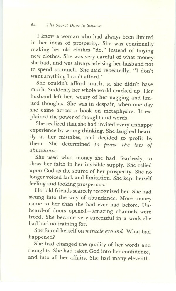 She used what money she had, fearlessly, to show her faith in her invisible supply. She relied upon God as the source of her prosperity. She no longer voiced lack and limitation. She kept herself feeling and looking prosperous.