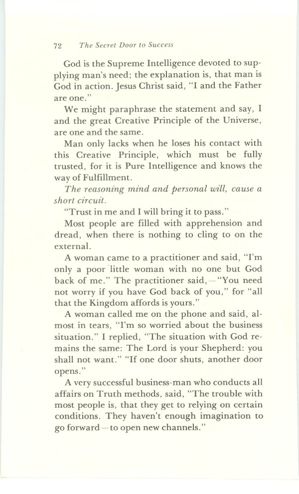 Man only lacks when he loses his contact with this Creative Principle, which must be fully trusted, for it is Pure Intelligence and knows the way of Fulfillment.