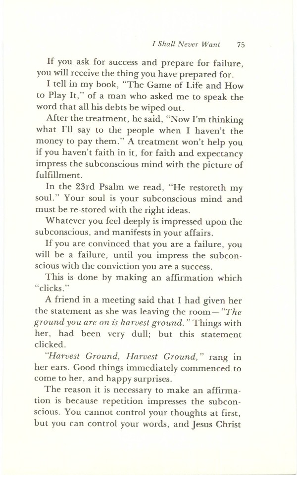 In the 23rd Psalm we read, "He restoreth my soul." Your soul is your subconscious mind and must be re-stored with the right ideas.