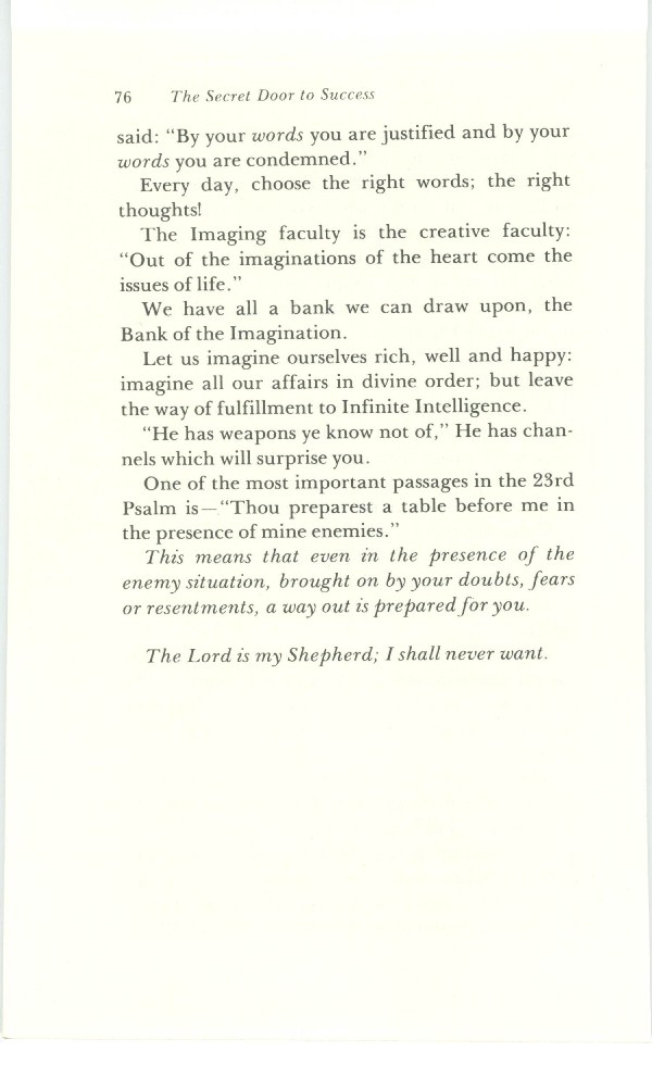 The Secret Door to Success - Bricks Without Straw - And Five of Them Were Wise - What Do You Expect? - The Long Arm of God - The Fork in the Road - Crossing Your Red Sea - Watchman at the Gate - Way of Abundance - I Shall Never Want - Look With Wonder - Catch Up with Your Good - Rivers in the Desert - The Inner Meaning of Snow White and the Seven Dwarves - Contents -