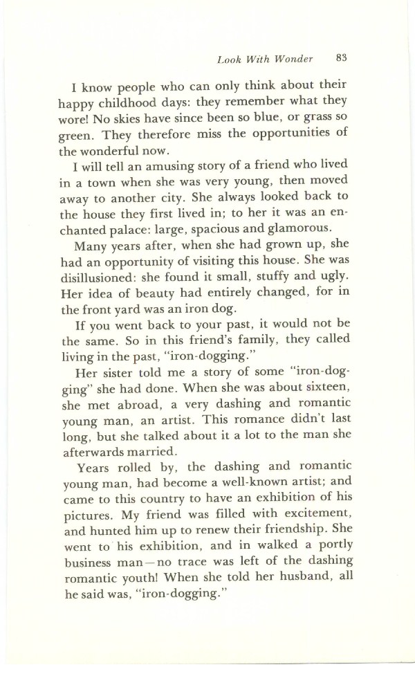 Many years after, when she had grown up, she had an opportunity of visiting this house. She was disillusioned, she found it small, stuffy and ugly. Her idea of beauty had entirely changed, for in the front yard was an iron dog.