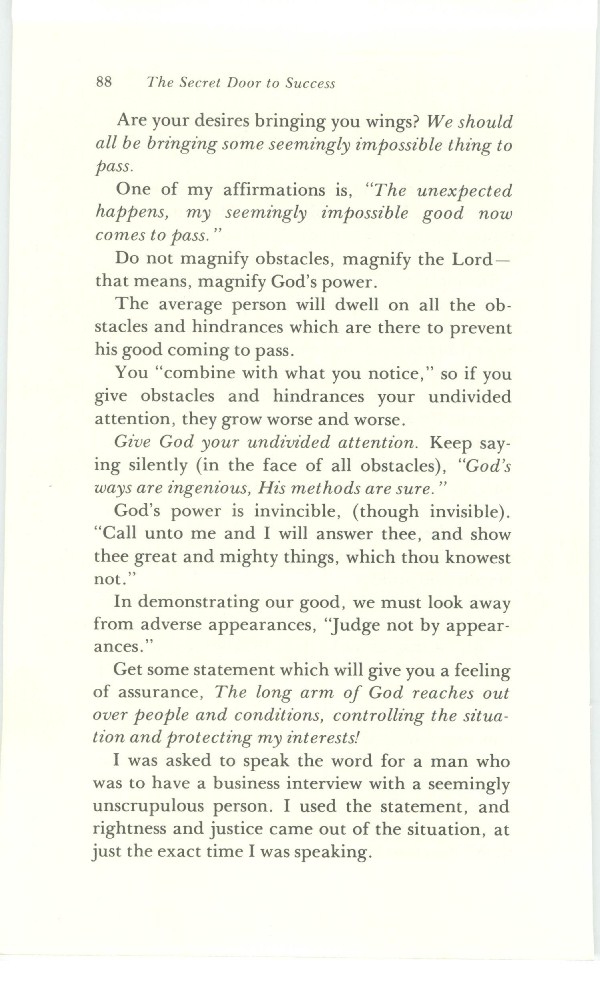 The Secret Door to Success - Bricks Without Straw - And Five of Them Were Wise - What Do You Expect? - The Long Arm of God - The Fork in the Road - Crossing Your Red Sea - Watchman at the Gate - Way of Abundance - I Shall Never Want - Look With Wonder - Catch Up with Your Good - Rivers in the Desert - The Inner Meaning of Snow White and the Seven Dwarves - Contents -