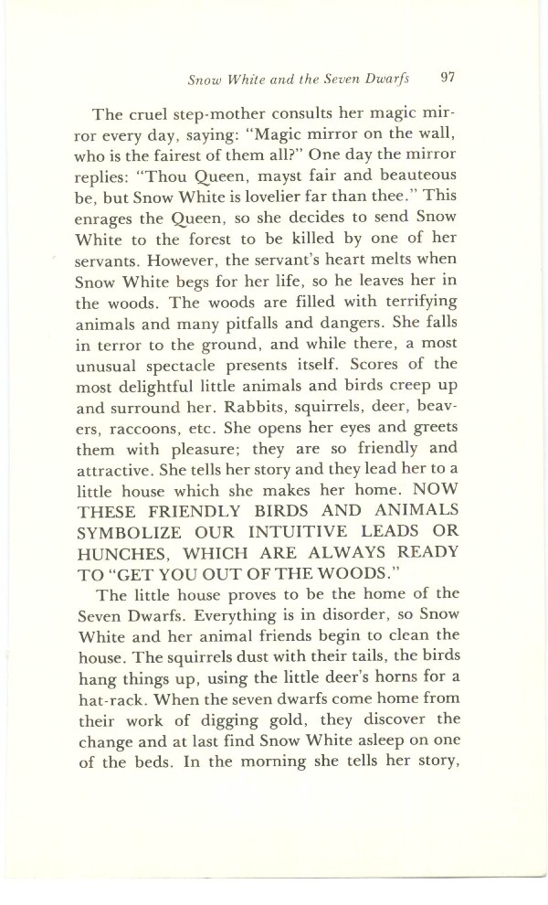 The cruel step-mother consults her magic mirror every day, saying: "Magic mirror on the wall, who is the fairest of them all?" One day the mirror replies: "Thou Queen, mayst fair and beauteous be, but Snow White is lovelier far than thee." This enrages the Queen, so she decides to send Snow White to the forest to be killed by one of her servants. However, the servant's heart melts when Snow White begs for her life, so he leaves her in the woods. The woods are filled with terrifying animals and many pitfalls and dangers. She falls in terror to the ground, and while there, a most unusual spectacle presents itself. Scores of the most delightful little animals and birds creep up and surround her. Rabbits, squirrels, deer, beavers, raccoons, etc. She opens her eyes and greets them with pleasure; they are so friendly and attractive. She tells her story and they lead her to a little house which she makes her home. NOW THESE FRIENDLY BIRDS AND ANIMALS SYMBOLIZE OUR INTUITIVE LEADS OR HUNCHES, WHICH ARE ALWAYS READY TO "GET YOU OUT OF THE WOODS."