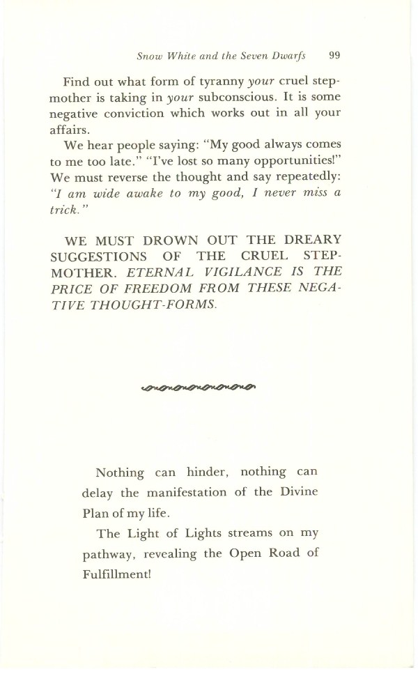 WE MUST DROWN OUT THE DREARY SUGGESTIONS OF THE CRUEL STEPMOTHER. ETERNAL VIGILANCE IS THE PRICE OF FREEDOM FROM THESE NEGATIVE THOUGHT-FORMS.